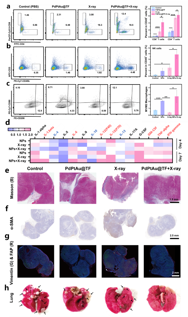 更为重要的是,平衡炎症反应介导的免疫激活和组织纤维化是克服放疗抵抗的一大挑战,PdPtAu@TF纳米酶联合放疗的治疗策略在激活免疫应答的同时,抑制了癌症相关成纤维细胞的增殖和组织纤维化的形成,并成功抑制了肿瘤转移(图5)。